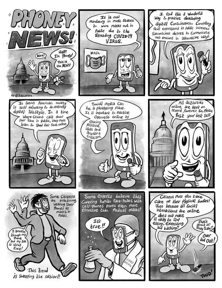 Phoney examines our relationship and dependency to technological communication and social media. The story revolves around a 13-year-old boy named Chris and his smartphone named Phoney. The more Chris uses Phoney the more Phoney knows about how Chris thinks and what he desires. Phoney is commentary for understanding the existential reality of owning a smartphone, while examining our relationship and dependency to technological communication and social media. All cartoons drawn digitally on a Wacom Cintiq.